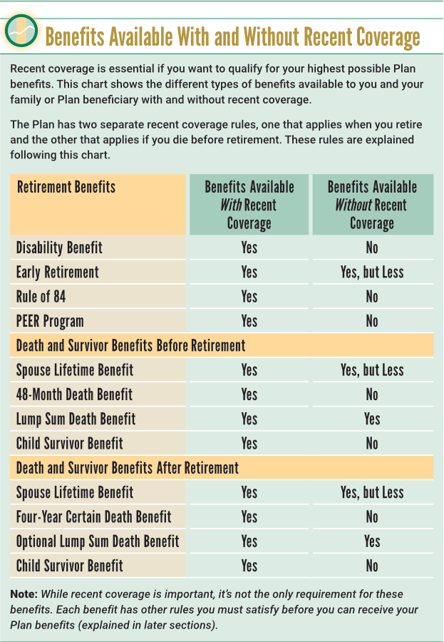 A. Many Plan benefits are not available unless you have recent coverage. Others are higher if you have recent coverage. Click here to see which Plan benefits require recent coverage and which benefit amounts are higher with recent coverage.