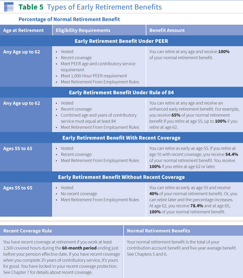 A. As long as you’re vested when you leave the Plan and are considered retired from employment, you can start receiving benefits as early as age 55, or even earlier if you qualify under the Rule of 84 or a PEER program. See a summary of these four types of early retirement benefits available to vested participants.