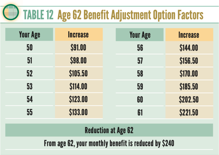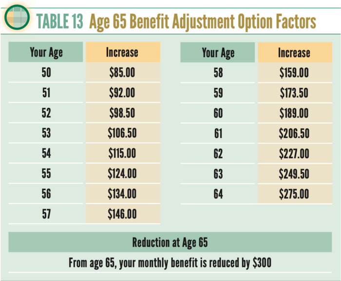 If you choose to add the benefit adjustment option, you receive an increased life only pension until age 62 or age 65, whichever age you choose. The actual increase depends on your age on your pension effective date and whether you want the increase to stay in effect until age 62 (See Table 12) or age 65 (See Table 13).