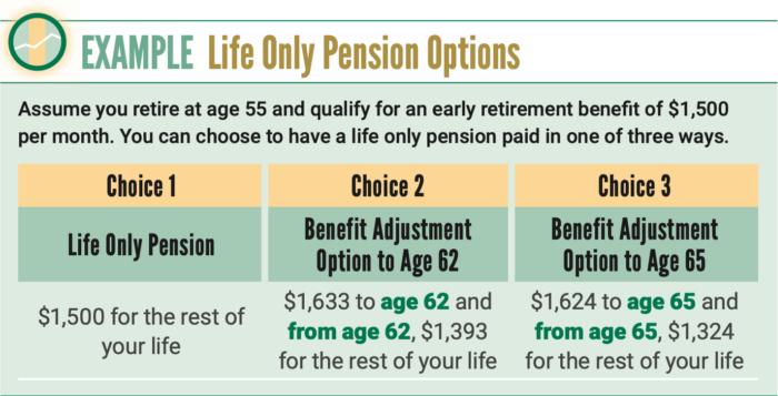 Assume you are age 55 when you retire and your life only pension is $1,500 but you elect the age 62 benefit adjustment option under which your benefit is $1,633 up to age 62 and then $1,393 for the rest of your life.