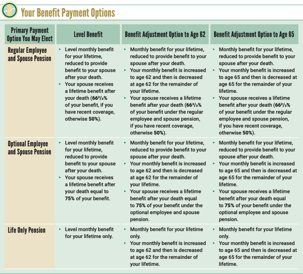 The packet explains the benefit payment options available to you and the procedures you must follow to choose the benefit payment option you want. If you are married, your spouse’s written consent to your choice of payment option and pension effective date is required.