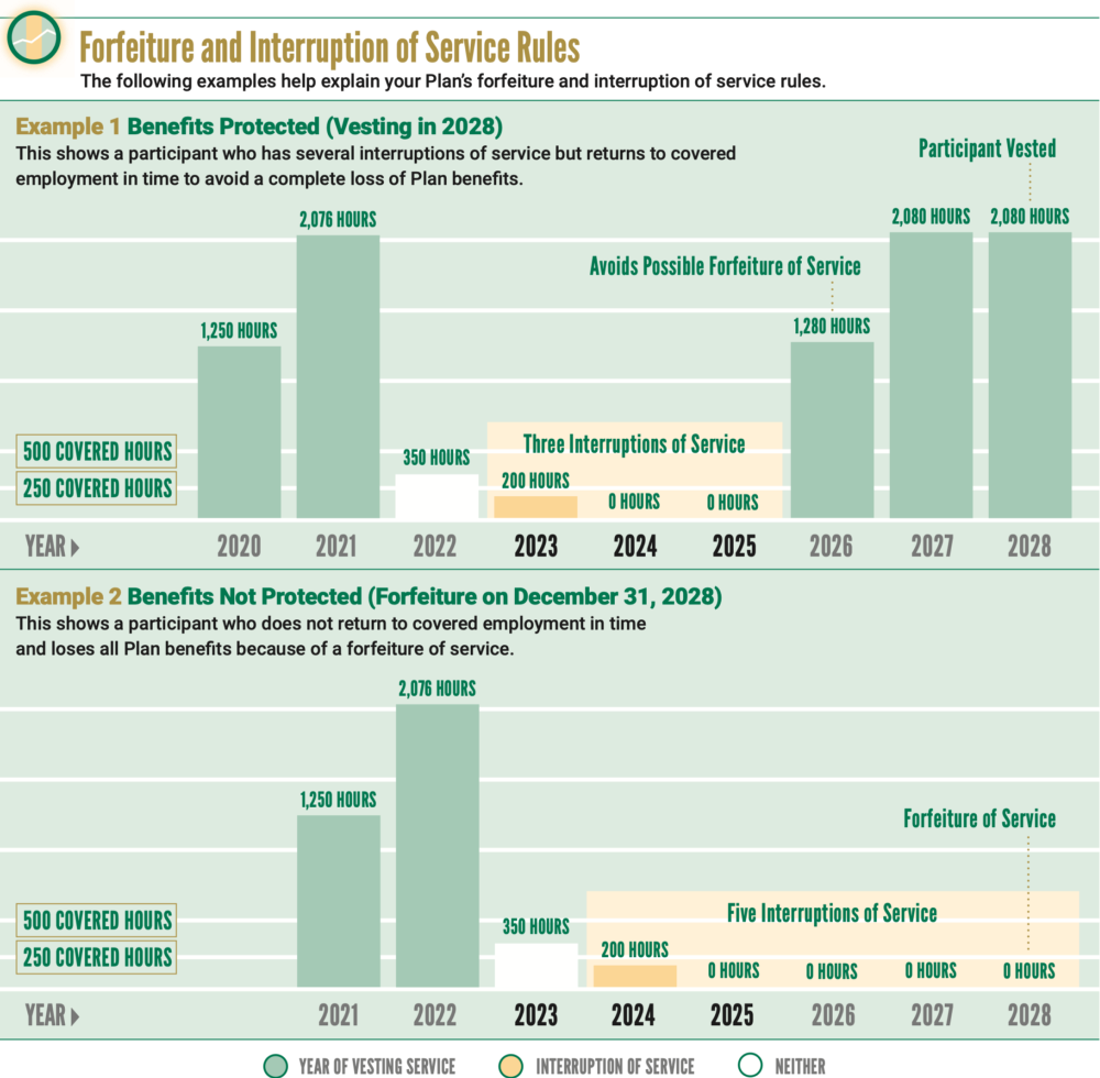 Click here for two examples that help explain your Plan’s forfeiture and interruption of service rules. The first shows a participant who has several interruptions of service but returns to covered employment in time to avoid a complete loss of Plan benefits. The second shows a participant who does not return to covered employment in time and loses all Plan benefits because of a forfeiture of service.