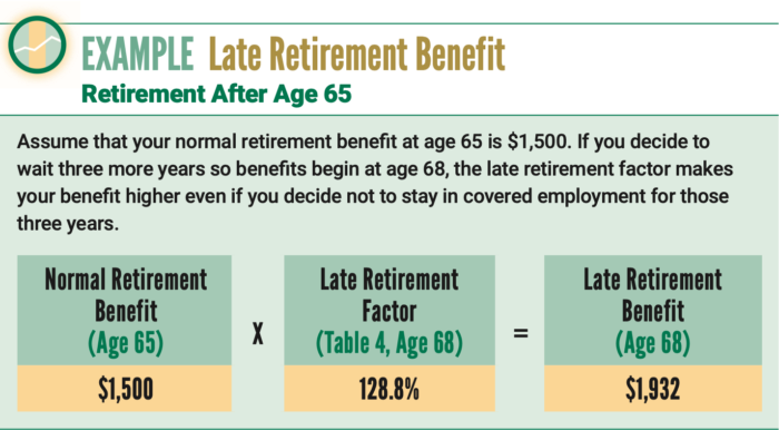If you choose to begin receiving your benefits at age 65, you will receive 100% of your normal retirement benefit. If you decide to start receiving your benefits later, your normal retirement benefit is increased for each month after age 65 that you delay your retirement up to age 70. This is called your late retirement factor.