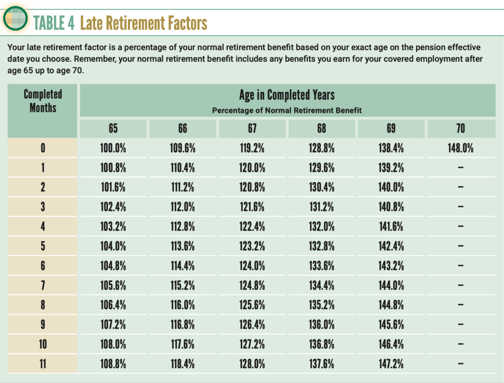 If you wait to retire after age 65, your normal retirement benefit is based on all your covered hours up to your pension effective date and is multiplied by a late retirement factor. Each month you wait increases your late retirement factor. Click here to see how your late retirement factor increases—up to the Plan maximum of 148% if your pension begins at age 70. Click here for an example of calculating your late retirement benefit (after age 65).