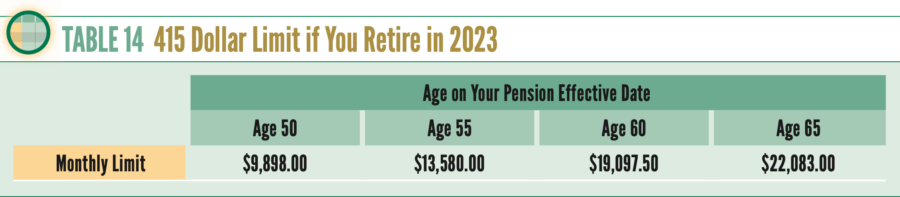 Step 1—The Plan determines your 415 Dollar Limit. Since you are retiring in 2023 at age 55, your monthly 415 Dollar Limit from above is $13,580.00.